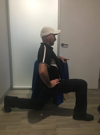 Starting in the “lunge position” both legs bent at the knee 90 degrees one foot flat on the ground, one knee on the ground directly below the torso. Push your hips forward while keeping the knee and front foot stationary and keeping your upper body upright. You should feel this stretch in the front of the hip.